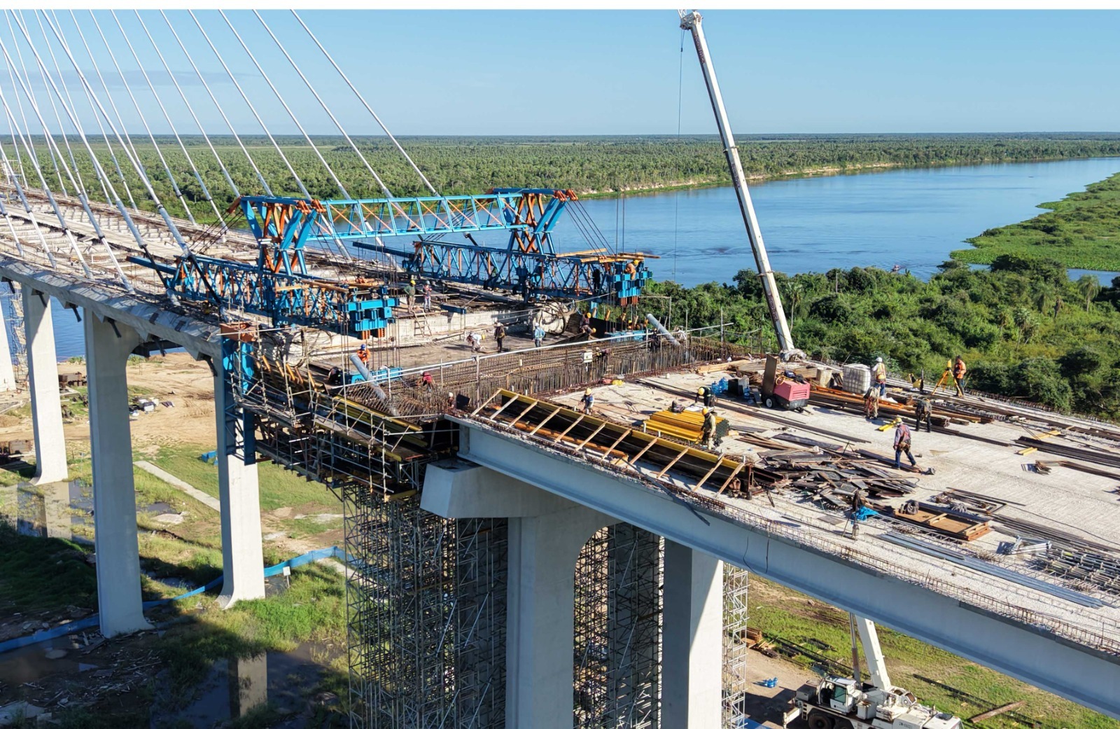 Iniciada em 2022 e financiada pela Itaipu Binacional, está na fase final. O chamado “beijo das aduelas”, que marca o encontro das duas partes da ponte no centro do rio, está previsto para o fim de maio. Ou seja, é uma etapa crítica, com alto nível de operação simultânea.
