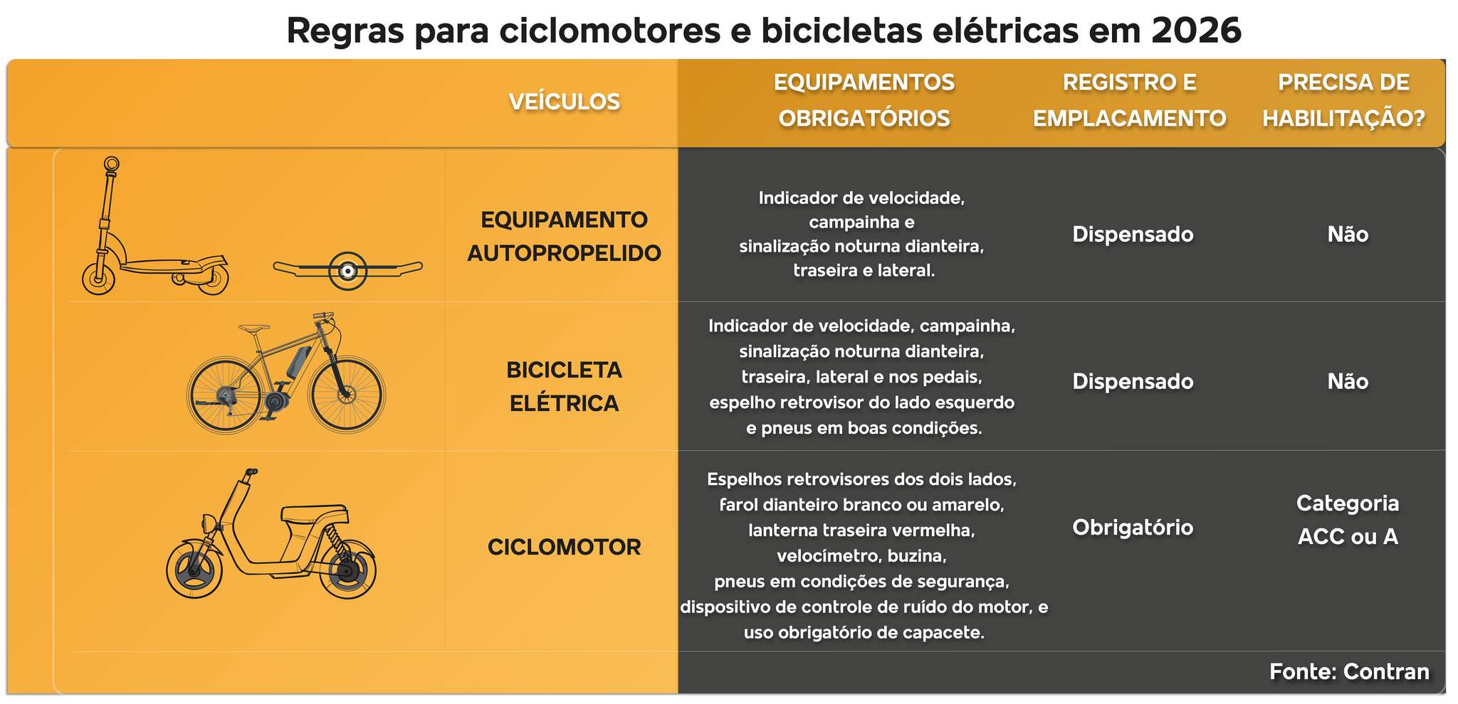 Os ciclomotores terão que ter CNH na categoria A (motos) ou ACC (Autorização para Conduzir Ciclomotor); uso de capacete; e emplacamento.