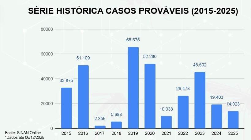 O número seguiu alto em 2020 (52.580 casos prováveis). Mas registrou redução no comparativo com 2021 (10.038) e 2022 (26.478). Em 2023, novo pico, com 45.502 casos, num novo ciclo de queda.