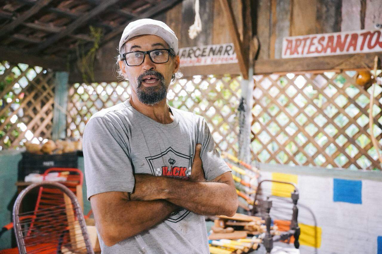 Conhecido como mestre Paulo Maneiro, ele é de Bodoquena e mora na Capital há cerca de 35 anos. No terreno, ele construiu recentemente um salão onde dá aulas. Além da capoeira, Paulo também trabalha como artesão e marceneiro. No local, fabrica berimbaus, bancos e móveis com madeira reaproveitada.