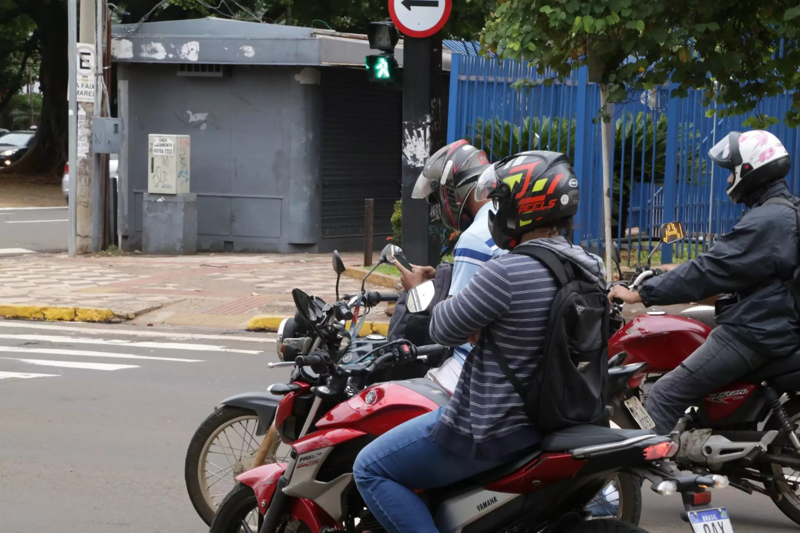 Enquanto espera semáforo ficar verde, motociclista checa celular no Centro (Foto: Arquivo)