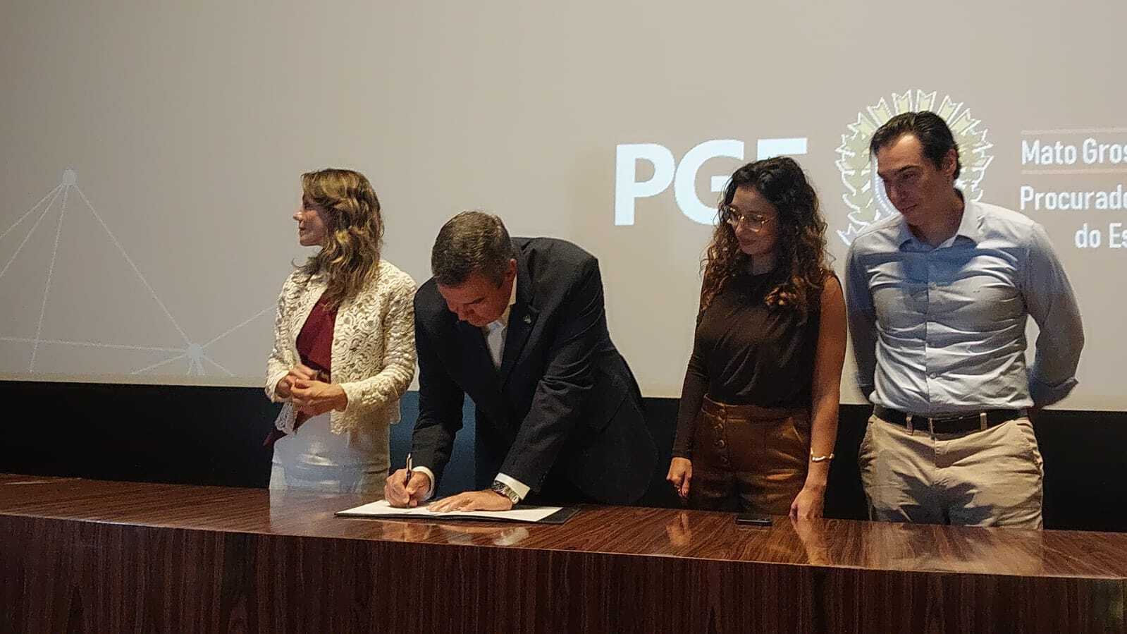 Governador Eduardo Riedel assinando decreto que institui a olítica de Linguagem Simples (Foto: Judson Marinho)