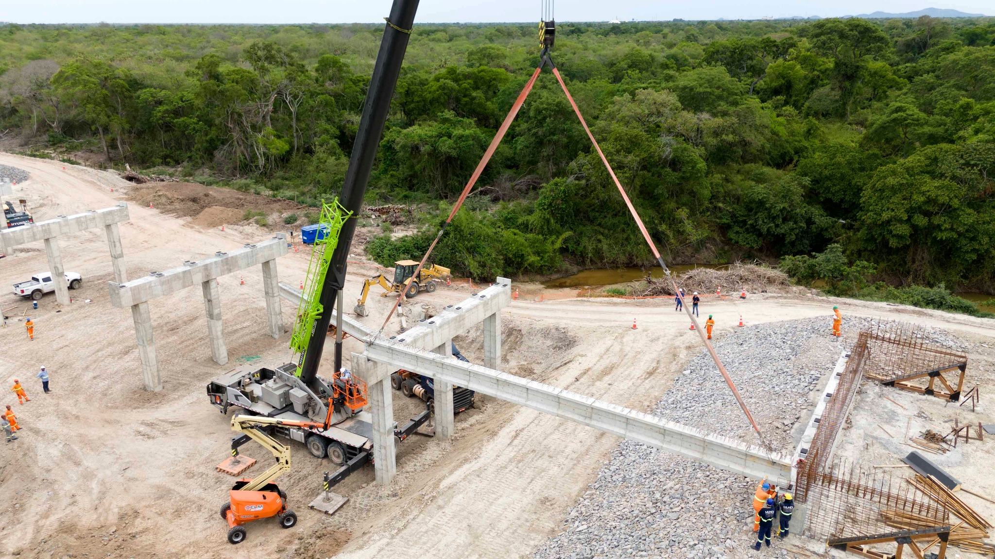 A fase seguinte prevê a colocação das demais vigas e a finalização do tabuleiro. Na sequência, serão executados os serviços de concretagem da laje, pavimentação e instalação dos dispositivos de segurança, como barreiras e sinalização.