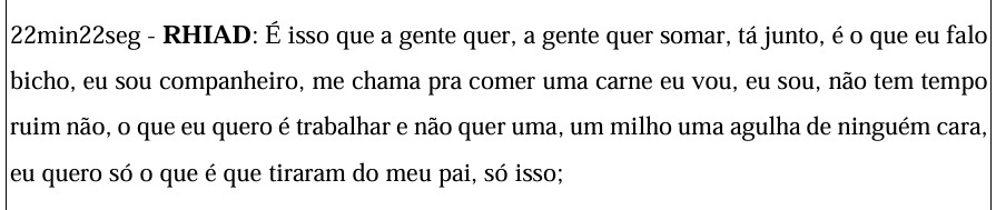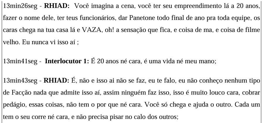 Em tom de lamento, segundo a transcrição anexada ao processo, Rhiad afirma que o pai foi obrigado a deixar o empreendimento após cerca de 20 anos. Em um dos trechos, diz: “Você imagina a cena, você ter seu empreendimento lá há 20 anos, fazer o nome dele, ter teus funcionários, dar panetone todo final de ano pra toda equipe, e os caras chegam na tua casa lá e ‘vaza’”.