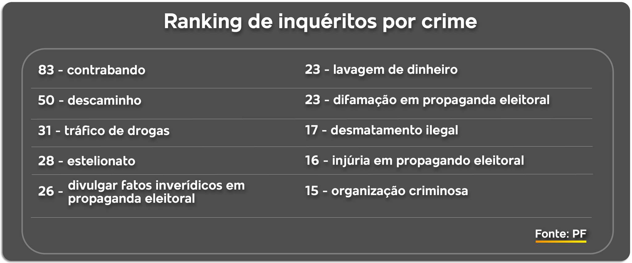 Agora, conforme os dados atualizados até hoje, o contrabando lidera a lista, enquanto o tráfico ocupa a terceira posição. Os crimes de estelionato estão em seguida, com 28 inquéritos. A divulgação de fatos inverídicos em propaganda eleitoral representa 26 investigações, seguida da lavagem de dinheiro e difamação eleitoral.