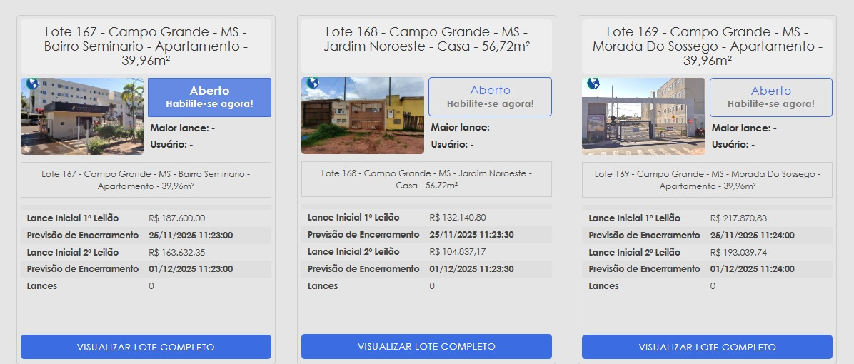 O novo leilão de imóveis da Caixa Econômica Federal abriu oportunidades para quem busca comprar casa ou apartamento em Mato Grosso do Sul. Ao todo, são nove unidades no Estado, sendo oito em Campo Grande e uma em Rio Brilhante. Os lances iniciais variam de R$ 132 mil a R$ 217 mil, dependendo do bairro e da metragem do imóvel.