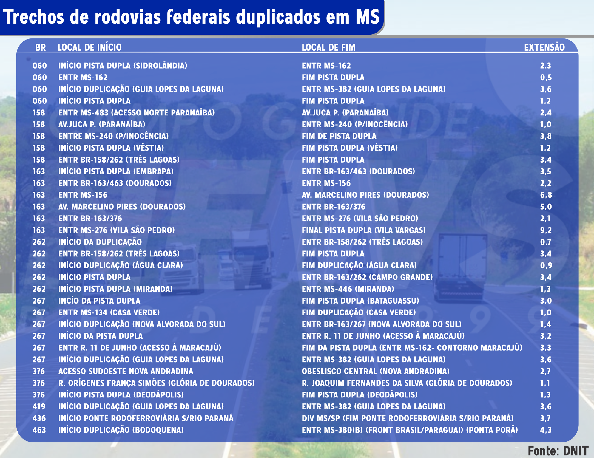 A extensão duplicada no estado, segundo dados do DNIT (Departamento Nacional de Infraestrutura de Transportes) e da Agesul (Agência Estadual de Gestão de Empreendimentos), é equivalente à distância de Campo Grande ao município de São Gabriel do Oeste, no norte do estado: 137 quilômetros.