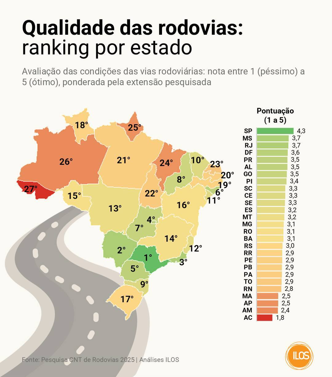 Estado atinge nota 3,7 em índice da ILOS, com base na Pesquisa CNT, atrás apenas de São Paulo, com 4,3
