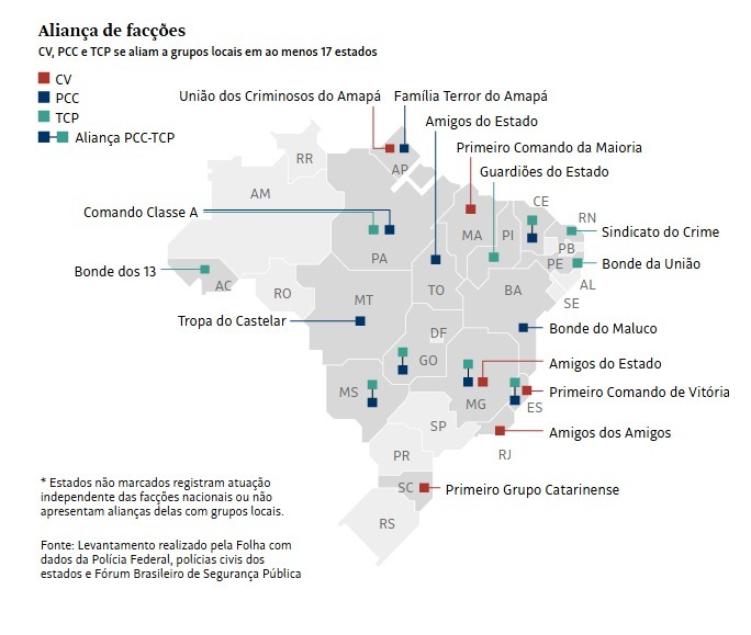 Ainda conforme a apuração da Folha, a partir de 2017, o CV intensificou a expansão para o Norte e Nordeste brasileiros e se apoiou em alianças com grupos regionais, mantendo o foco no controle territorial armado e exploração de atividades locais. Já o PCC voltou-se para o atacado e firmou parcerias para garantir o fluxo das cargas de entorpecentes.