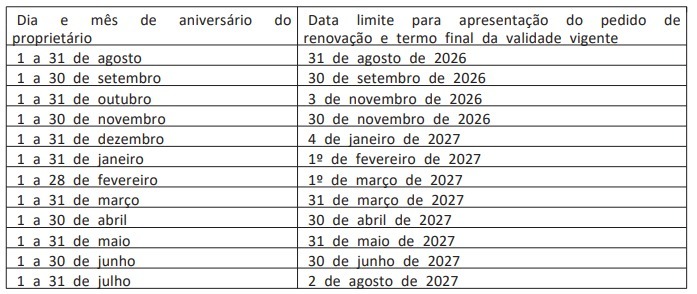 Na prática, a norma organiza a renovação dos registros concedidos antes de julho de 2023, evitando que todos os pedidos sejam feitos ao mesmo tempo. O cronograma distribui as solicitações ao longo de 12 meses, com datas-limite que variam conforme o mês de aniversário. Quem nasceu em agosto, por exemplo, deve renovar até 31 de agosto de 2026. Já aniversariantes de janeiro terão prazo até o início de fevereiro de 2027.