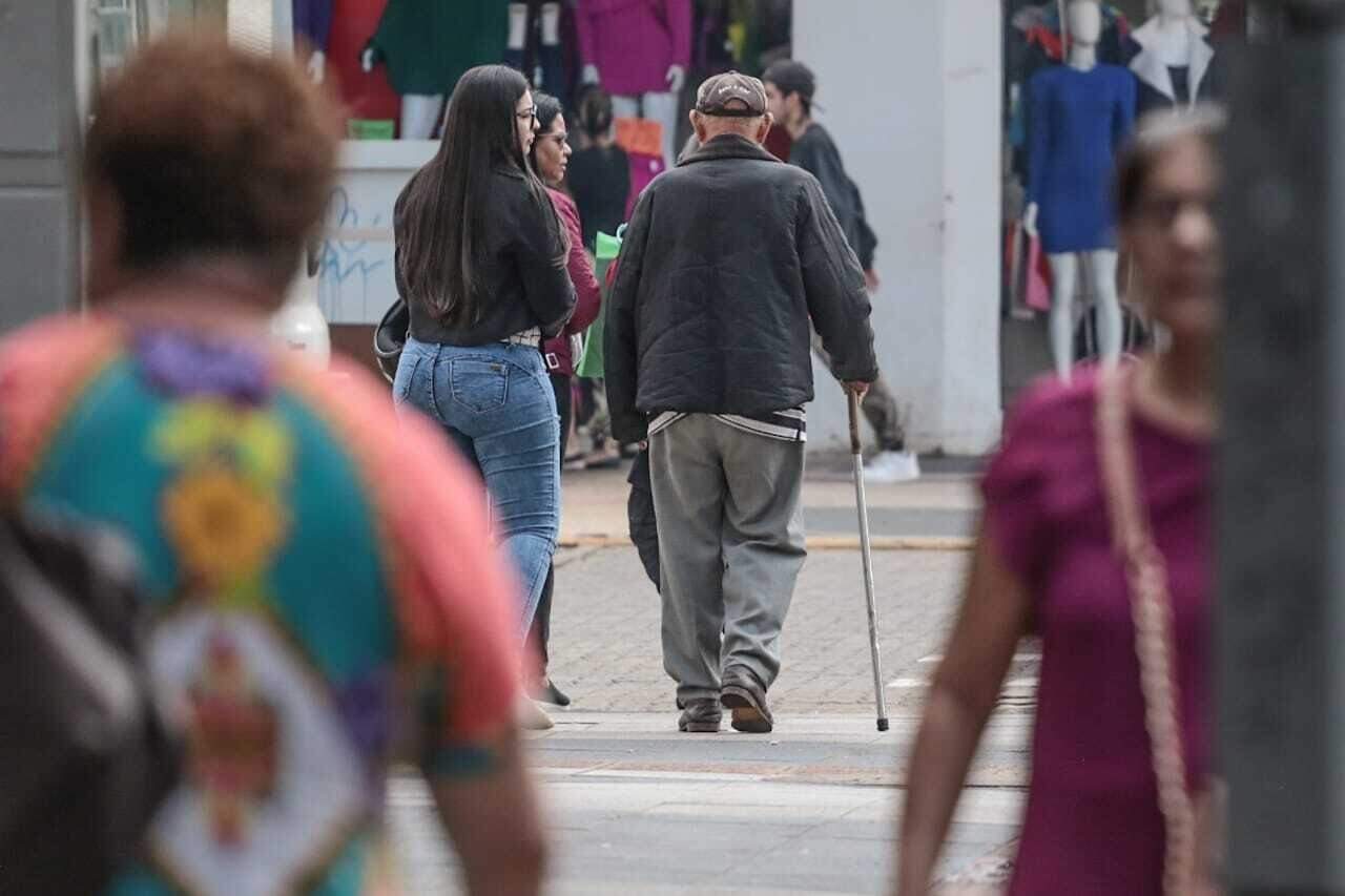 Idoso, de bengala, caminhando na Rua 14 de Julho, em Campo Grande (Foto: Marcos Maluf)
