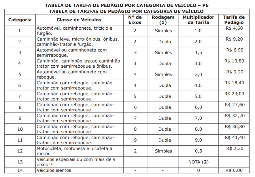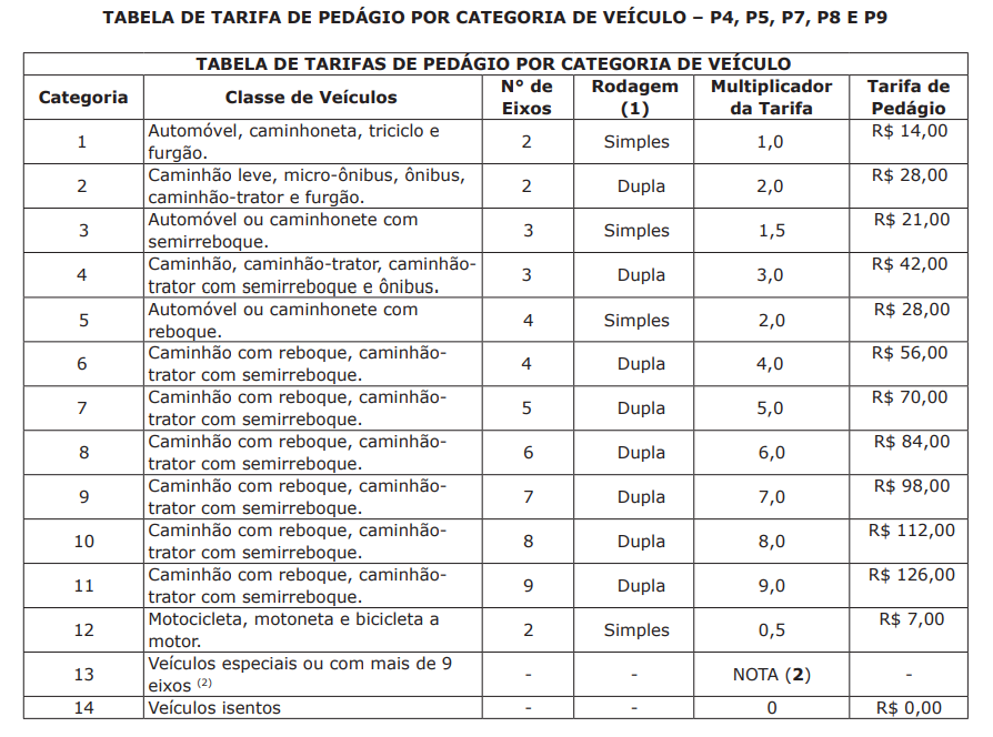 O valor final da tarifa para veículos da categoria 1 passa a ser de R$ 14 nas praças P4, P5, P7, P8 e P9. As tarifas para as demais categorias de veículos também foram atualizadas e constam em tabelas anexas à portaria. Motociclistas agora pagarão R$ 7,00. O maior valor é para caminhões com 9 eixos, que chega a R$ 126,00.