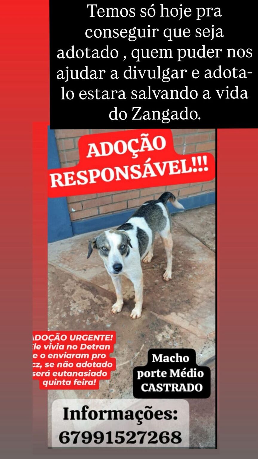 A protetora independente de animais Andréia Gasparello procura interessados em adotar um cão vira-lata conhecido como Zangado. O animal vivia no Detran (Departamento Estadual de Trânsito), em Campo Grande, onde era cuidado e alimentado por funcionários. No entanto, após um ataque a um funcionário terceirizado, que sofreu arranhões e formalizou uma reclamação, o cão foi recolhido pelo GCZ (Gerência de Controle de Zoonoses).