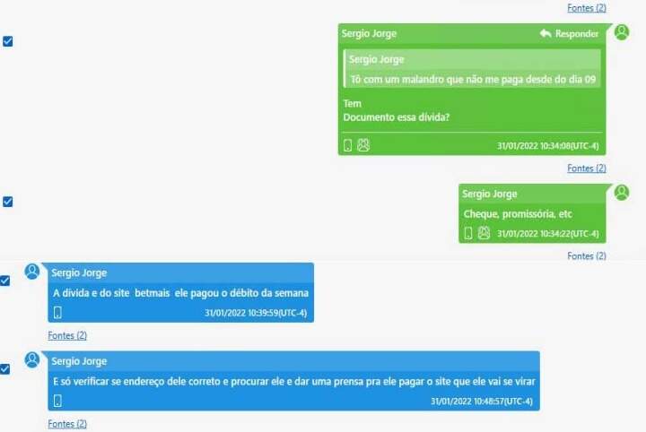 Gilberto pergunta se há alguma prova do débito: “cheque, promissória, etc.” e Sergio responde negativamente: “a dívida é do site betmais. É só procurar ele e dar uma 'prensa' nele para ele pagar o site, que ele vai se virar”, afirma, demonstrando o costume com a violência.