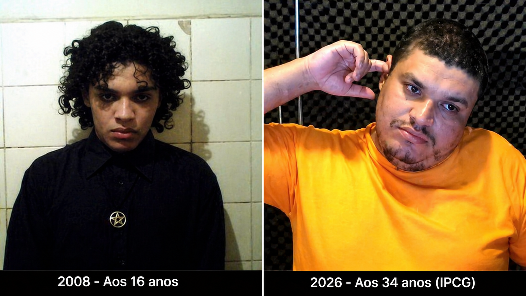 Imagens recentes mostram um Dyonathan bem diferente daquele adolescente que ganhou notoriedade nacional em 2008. Hoje, ele aparece com o rosto mais cheio, cabelo curto e aparência distinta da fase em que tinha cabelos mais longos e visual marcante à época dos crimes.