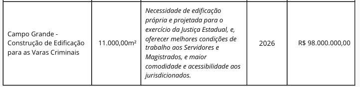 A empresa GVC Engenharia, Projeto e Avaliações Ltda., de Londrina (PR), foi contratada por R$ 11,3 mil para realizar a topografia do imóvel onde será instalado o futuro Fórum Criminal de Campo Grande, que terá seis varas. As obras devem começar em 2026, no prédio atualmente ocupado pelo Batalhão de Trânsito da Polícia Militar, na rua Barão do Rio Branco, esquina com a Bahia. O custo estimado da construção é de R$ 98 milhões.