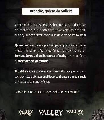Já o Valley CG adotou um discurso direto, afirmando que todas as bebidas comercializadas são adquiridas exclusivamente de fornecedores e distribuidoras oficiais, também com nota fiscal. A publicação destacou que a preocupação é garantir “qualidade, confiança e transparência em cada dose servida” e concluiu com a mensagem: “Bebida boa, festa boa e responsabilidade sempre”.
