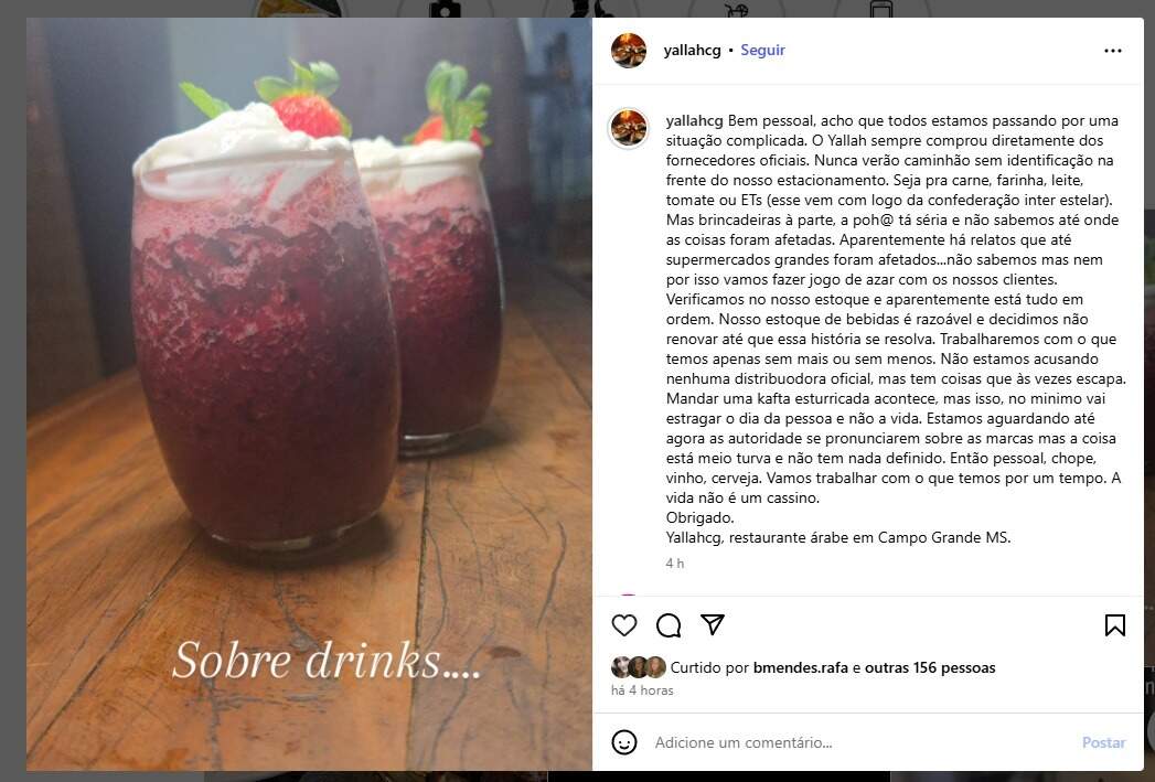Reação dos bares - No Yallah CG, a postagem mistura tom de descontração com alerta. A casa ressaltou que sempre trabalhou com fornecedores oficiais e que “nunca entrou caminhão sem identificação na porta do restaurante”. Segundo o comunicado, o estoque foi checado e está em ordem, mas, por precaução, não haverá reposição de bebidas até que as autoridades concluam as análises. “Não estamos acusando nenhuma distribuidora, mas coisas acontecem. Vamos trabalhar com o que temos para não correr riscos”, explicou a nota.