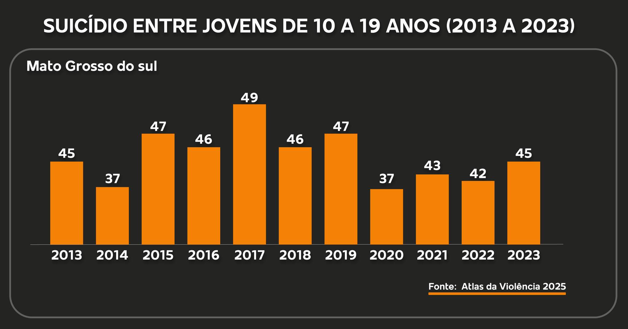 Estatísticas - Segundo o painel Sejusp (Secretaria Estadual de Justiça e Segurança Pública de Mato Grosso do Sul), o número de suicídios registrados entre janeiro e outubro deste ano, apenas em Campo Grande, somam 65. A reportagem pediu à assessoria de imprensa detalhes sobre a faixa etária e gênero das vítimas, mas não houve retorno até a publicação desta matéria.
