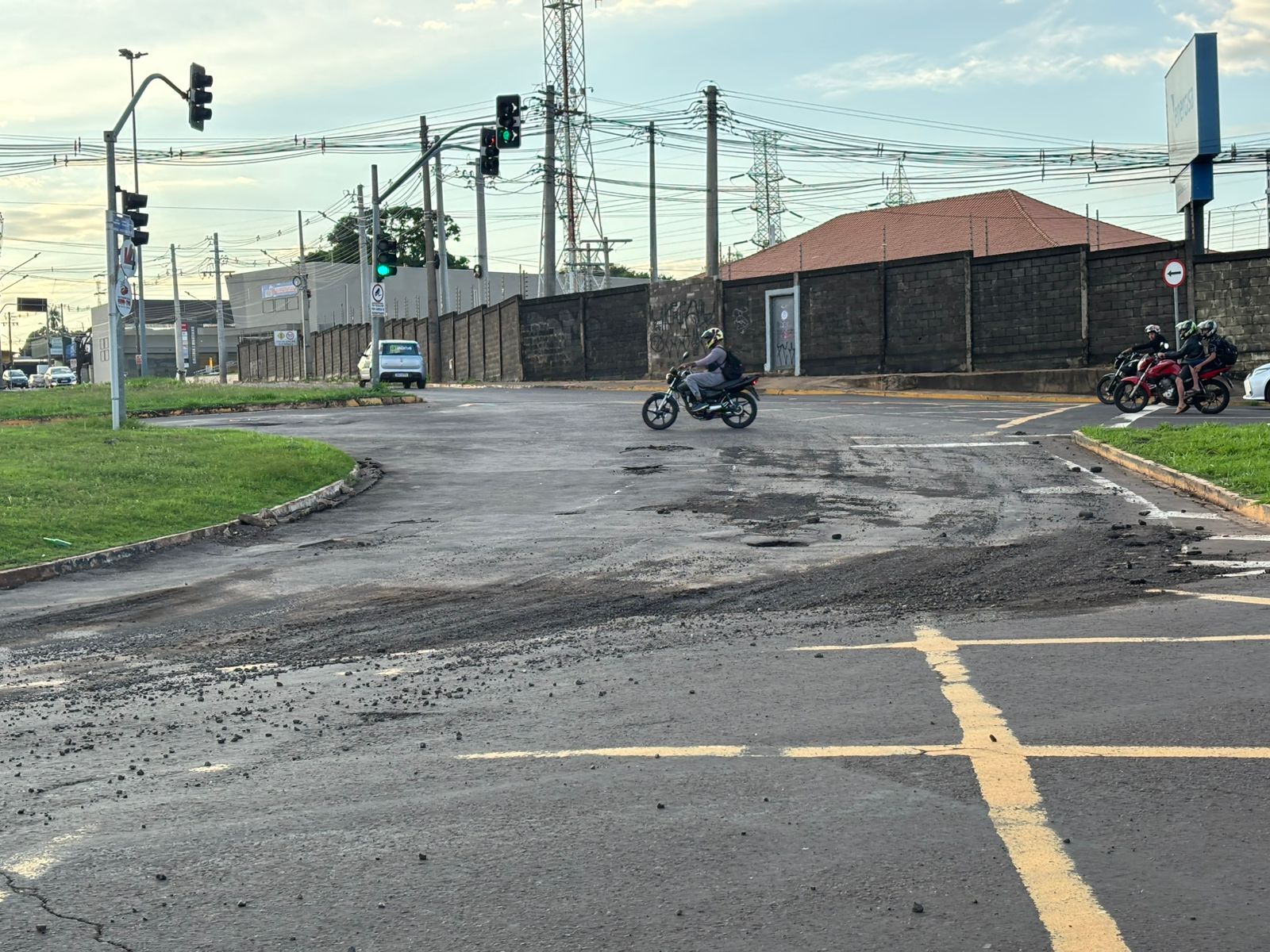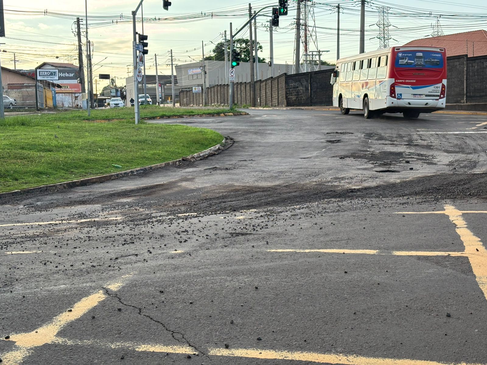 Asfalto volta a sofrer desgaste após chuva em rotatória de Campo Grande