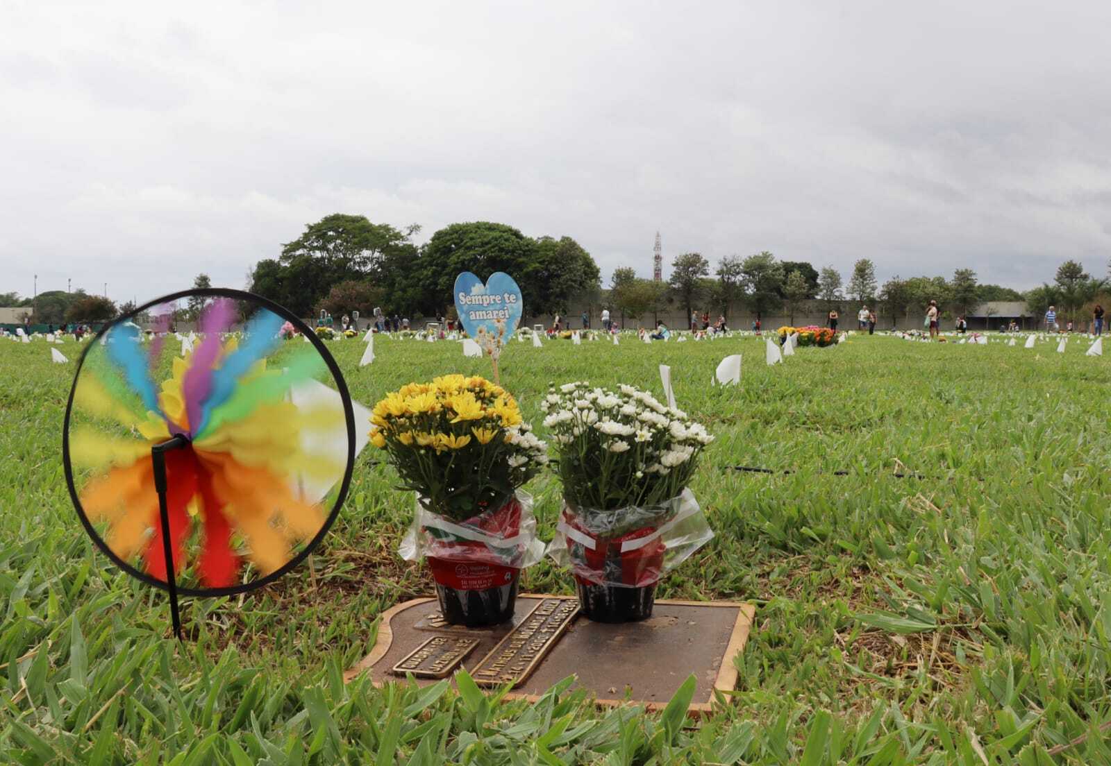 Flores deixadas em placa de identificação de um familiar, no Dia dos Finados, no Cemitério Jardim das Palmeiras em Campo Grande (Foto: Osmar Veiga)