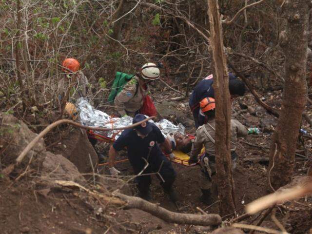 A retirada do locutor foi feita por seis bombeiros e quatro socorristas do Samu, que o carregaram em prancha por aproximadamente 200 metros antes de ancorá-lo sobre pedras e arbustos.