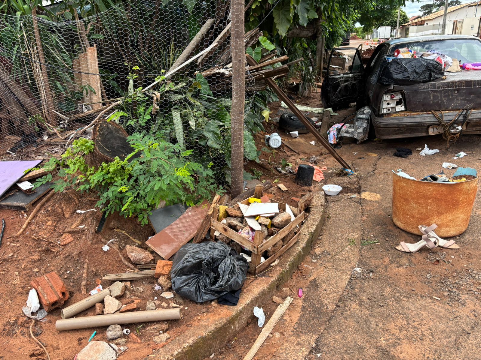 Vista geral da esquina das ruas Pinhão e Charim mostra acúmulo de entulho, estruturas improvisadas e sujeira espalhada pela via (Foto: Bruna Marques)