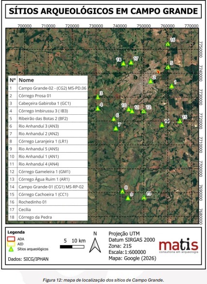 Um levantamento da consultoria em arqueologia Matis aponta que Campo Grande possui 18 sítios arqueológicos catalogados, distribuídos principalmente em áreas rurais e próximas a cursos d’água.