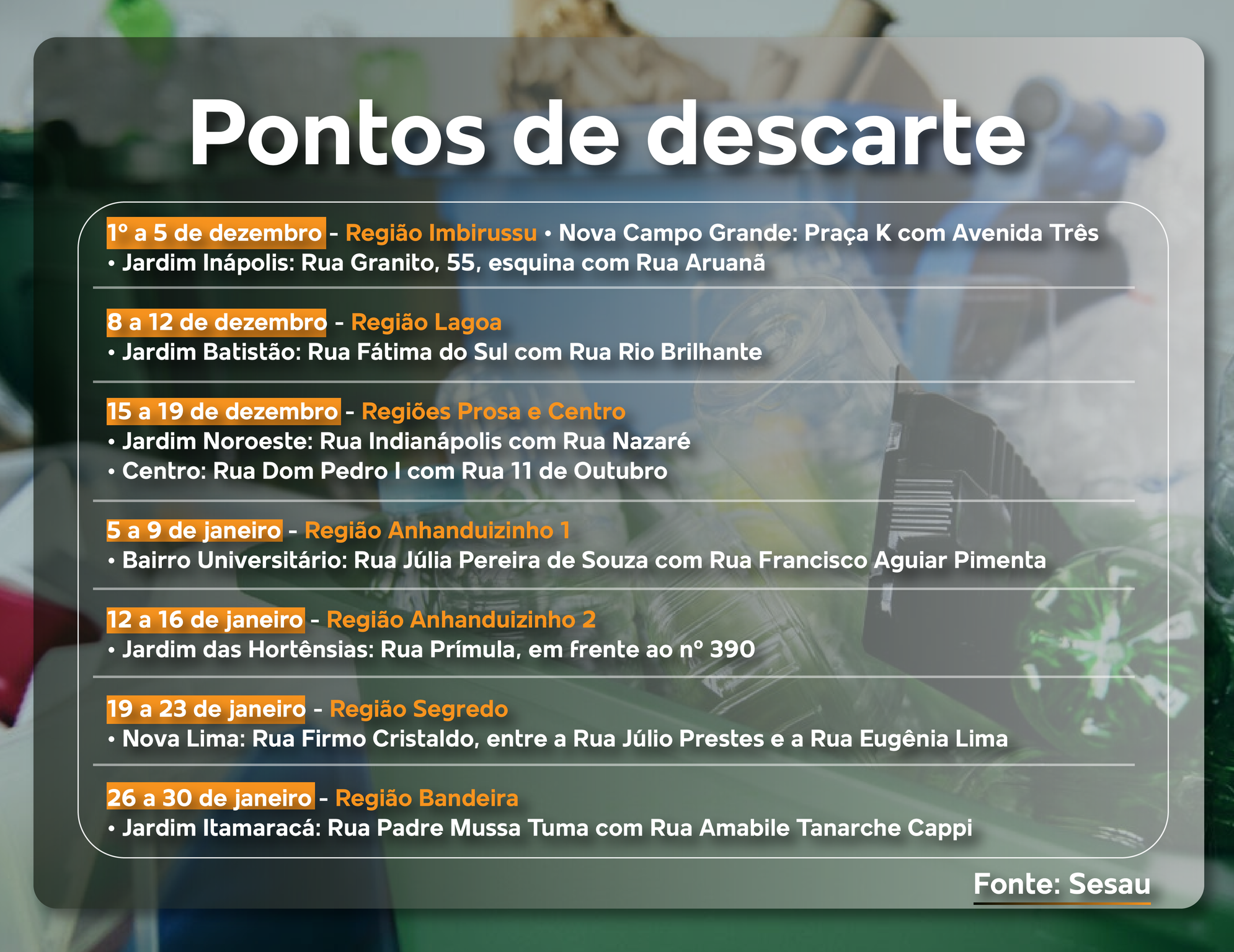 A Sisep (Secretaria de Infraestrutura e Serviços Públicos) ficará responsável pela retirada periódica dos resíduos, de acordo com o cronograma, para garantir que os locais não se transformem em novos pontos irregulares de descarte. Veja abaixo o cronograma dos pontos de descarte.