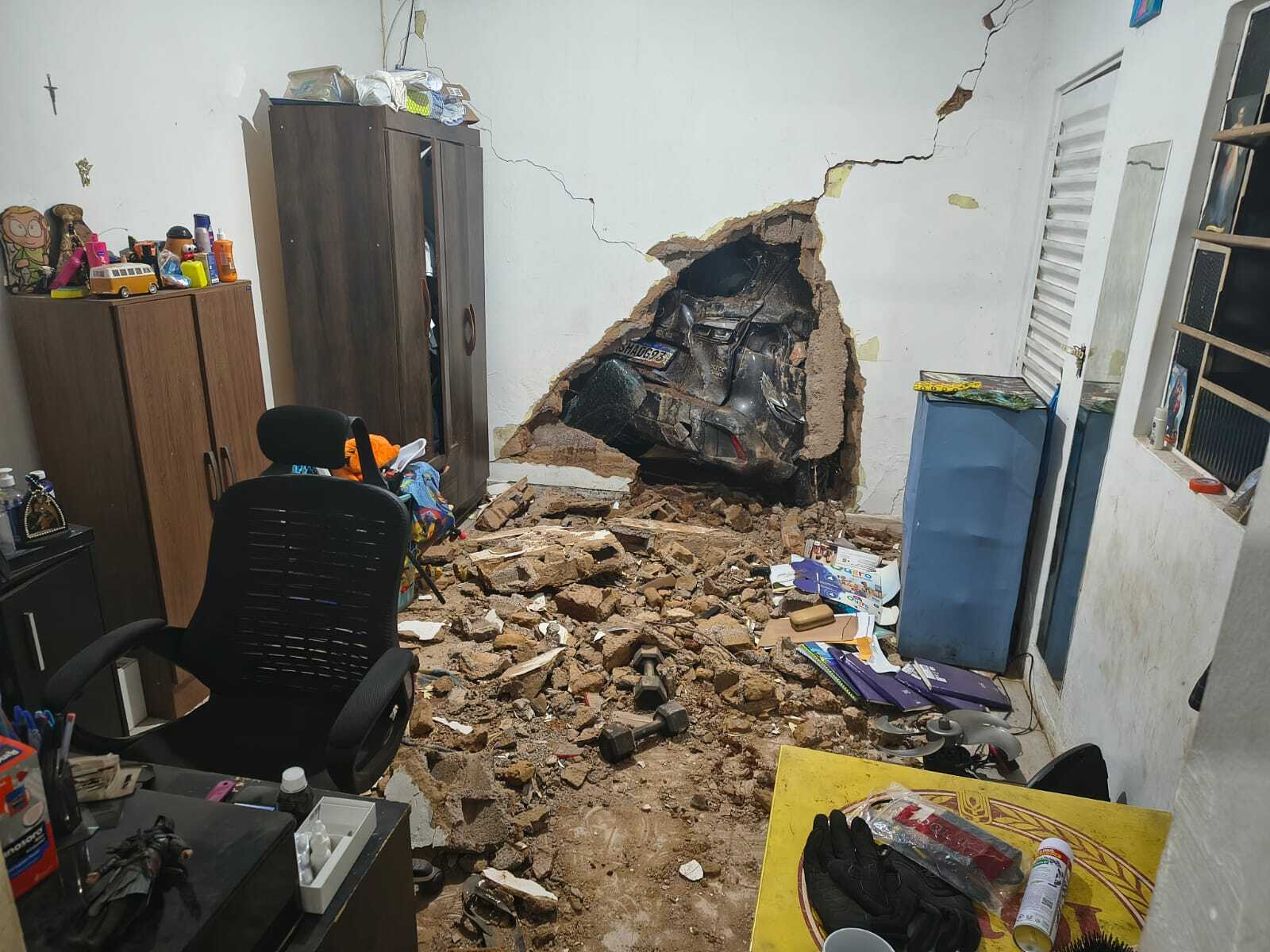 O veículo atingiu um quarto da residência. No momento do acidente, um dos moradores, de 23 anos, estava no cômodo usando o computador e escapou por pouco de ser atingido. Além dele, estavam na casa a mãe e o irmão de 9 anos. Assista ao vídeo abaixo.