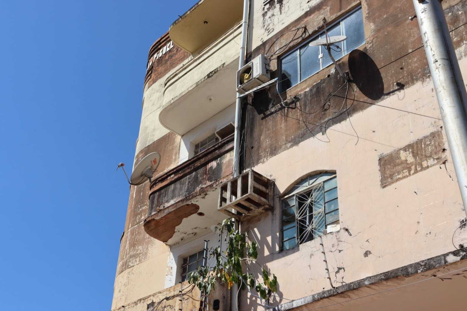 No Edifício São Félix, na Rua 14 de Julho com a Rua Dom Aquino, a parte térrea segue ocupada por lojas e lanchonetes, enquanto os andares superiores estão vazios e em deterioração visível, com pintura desgastada, infiltrações e estruturas expostas.