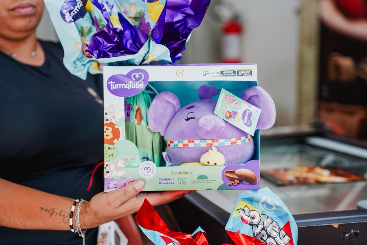 Entre os itens, ela destacou um ovo voltado ao público infantil com brinde temático, adquirido para um sobrinho autista. “Vem um ovinho, um bichinho e um cordãozinho. É uma opção diferente”, disse.