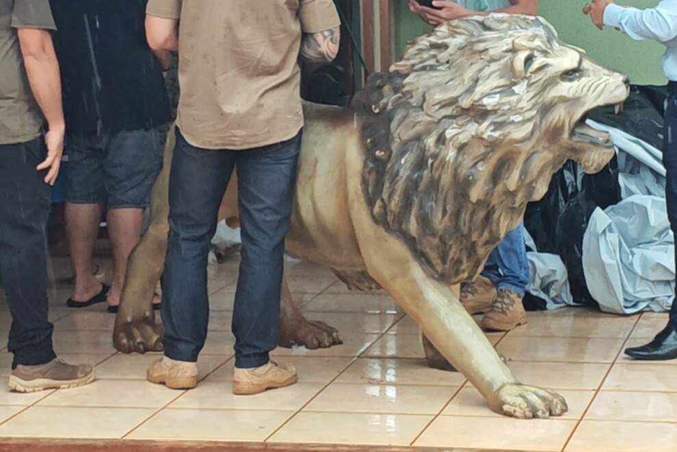 Depois, segundo o próprio Thiago, ao desconfiar da origem do objeto, decidiu tirar a estátua de casa e levou o leão para a residência de um amigo, no Bairro Aero Rancho, onde a peça foi encontrada embalada em plástico.