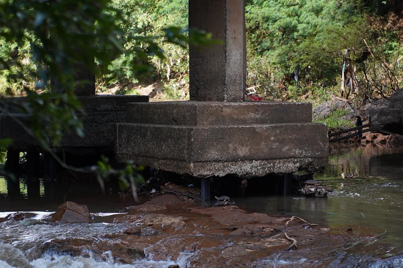 Os pilares da ponte estão com ferragens expostas. Nem a parte de baixo nem a de cima possuem rachaduras de tamanho significativo.