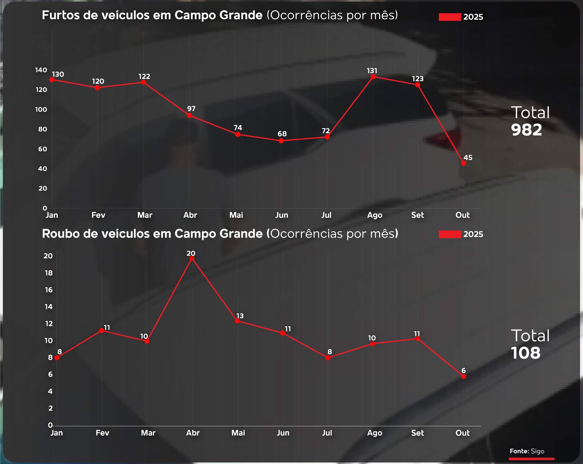 De acordo com as estatísticas da Sejusp, de janeiro deste ano até hoje, Campo Grande registrou 982 furtos de veículos, com variações mensais que revelam um padrão de oscilação ao longo do ano. Foram 130 casos em janeiro, 120 em fevereiro, 122 em março, 97 em abril, 74 em maio, 68 em junho, 72 em julho, 131 em agosto, 123 em setembro e, até agora em outubro, 45 ocorrências.