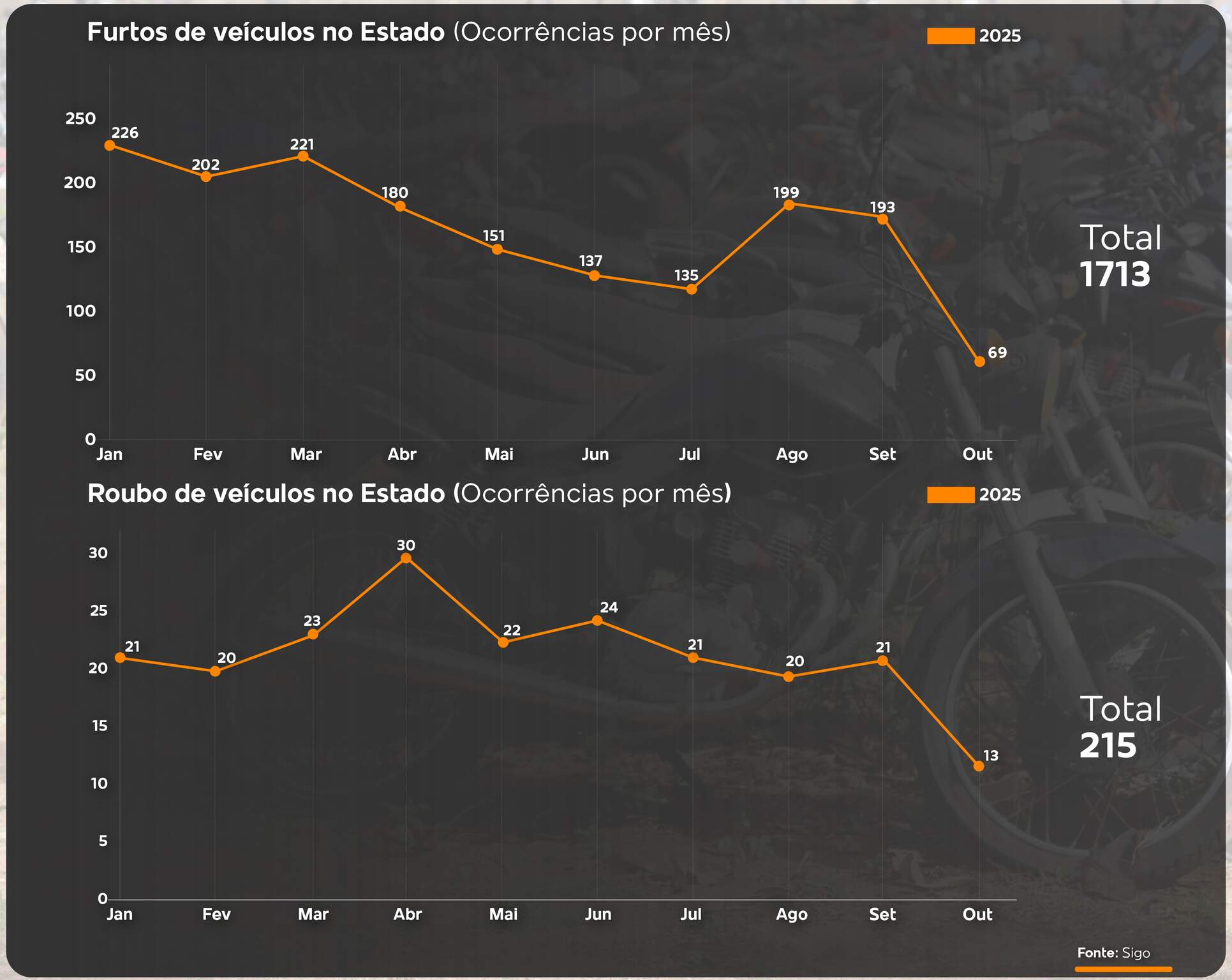 Já os roubos de veículos somam 108 registros desde o início de 2025. O mês com maior número de casos foi abril, com 20 ocorrências, seguido por maio (13), enquanto janeiro teve 8 registros, fevereiro 11, março 10, junho 11, julho 8, agosto 10, setembro 11 e outubro, até o momento, 6.