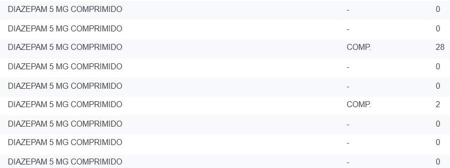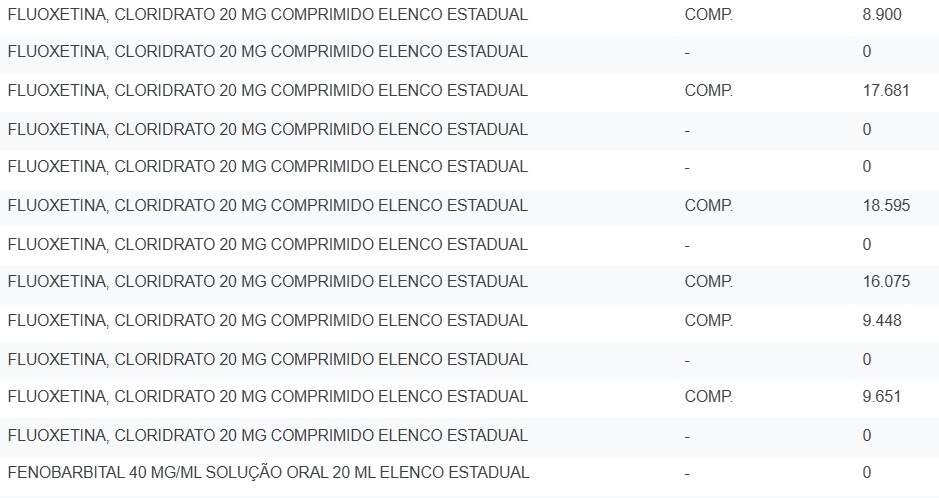 Entre os medicamentos ausentes estão prometazina, nortriptilina, nitrazepam, fluoxetina e diazepam — este último é o que mais aparece em falta. No caso da fluoxetina, por exemplo, o sistema mostra que há 16 mil comprimidos disponíveis no Caps Álcool e Drogas IV Fátima Medeiros, no Jardim São Bento, mas nenhum no Caps III Afrodite Dóris Contis, no Monte Castelo, nem em outras unidades.