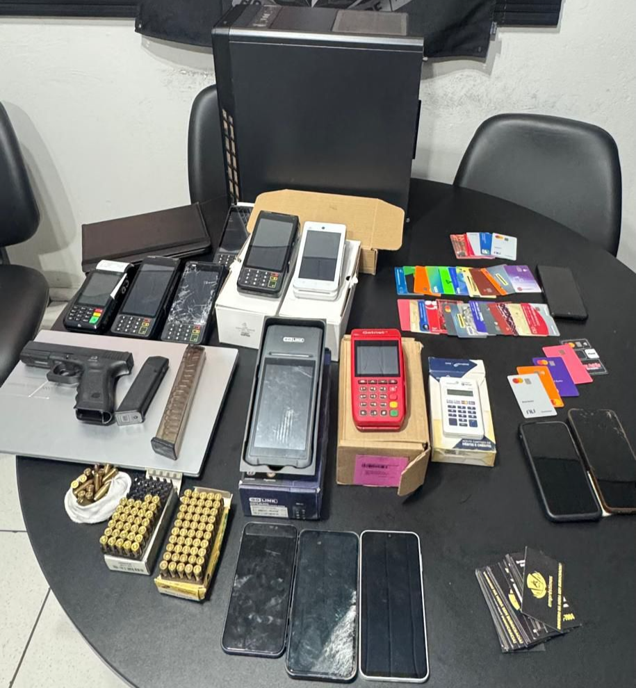 Ainda foram apreendidos uma pistola Glock com adulteração de numeração, um carregador de pistola comum, um carregador de pistola prolongado, aproximadamente 100 munições de arma de fogo calibre 9 mm, 8 máquinas de cartão de crédito, aproximadamente 40 cartões de crédito em nome de indivíduos diversos, um veículo importado, aparelhos celulares, computadores, entre outros objetos.