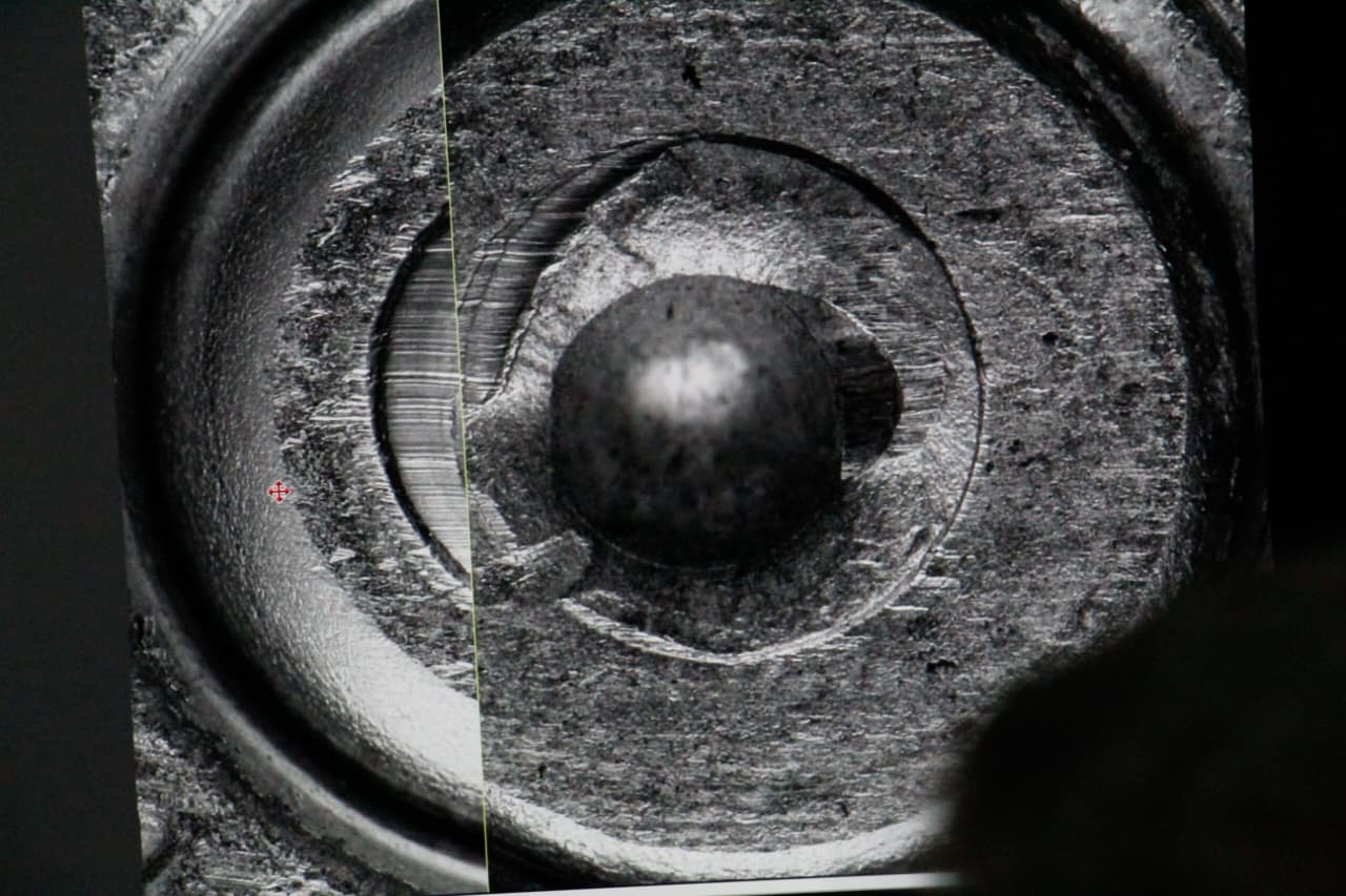 O profissional abre as duas imagens para verificar se têm equivalência: a do caso de referência e a do elemento coletado em local de crime ou retirado da vítima. Quando “dá hit”, a perícia liga a arma a um local e crime.