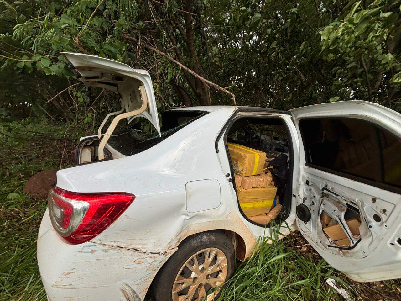 Renault Logan pegou fogo e estava tão abarrotado de droga que há tabletes de escondidos até sob o teto