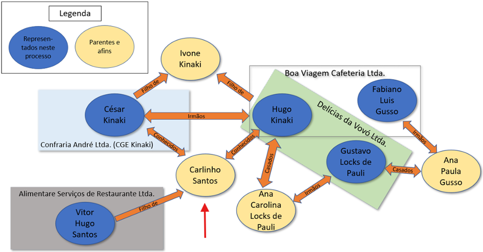 O Cade também identificou a existência de relações societárias, familiares e operacionais entre os envolvidos. Entre as empresas citadas na investigação estão Alimentare Serviços de Restaurante e Lanchonete, Boa Viagem Cafeteria Ltda., Delícias da Vovó Ltda. e Confraria André Ltda. O cruzamento de dados societários e depoimentos indicou que essas empresas estavam ligadas entre si por meio de parentesco, amizade ou participação societária indireta, o que facilitava a atuação coordenada nos processos licitatórios.