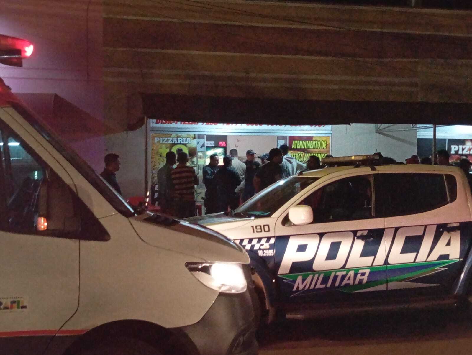 Equipes do Samu e Polícia Militar em frente à pizzaria (Foto: Arquivo/Campo Grande News)