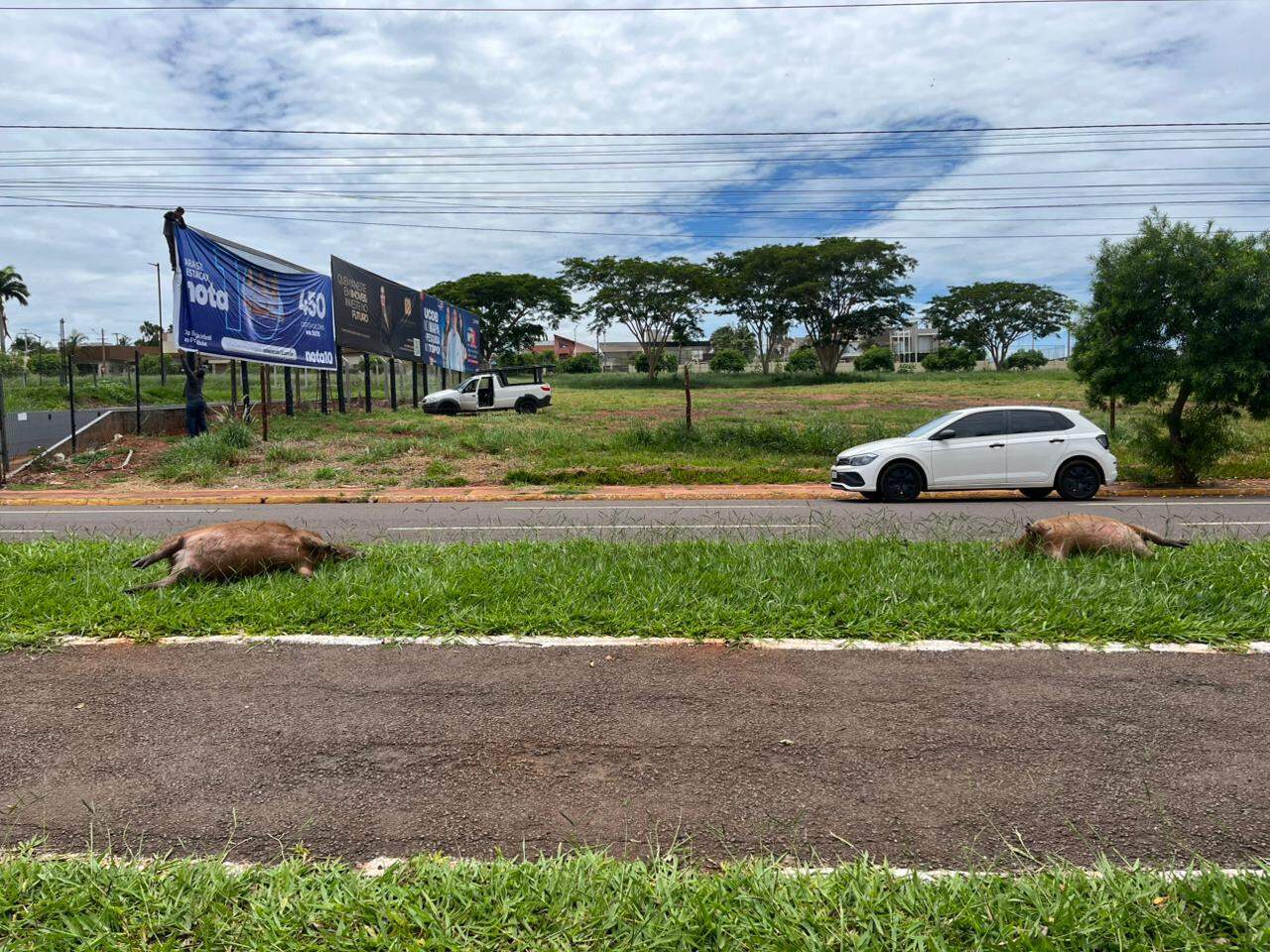 Duas capivaras filhotes foram encontradas mortas no canteiro central da Avenida Afonso Pena, próximo à entrada Guató do Parque das Nações Indígenas. A suspeita é de que os animais tenham sido atropelados durante a madrugada e, em seguida, os corpos colocados no canteiro para evitar novos acidentes.