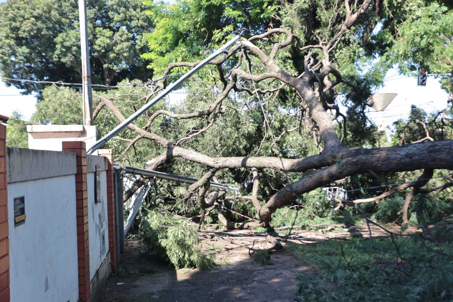 A árvore atingiu parcialmente o muro de uma casa e comprometeu totalmente o registro de energia de outra residência. Também foram registrados danos em portão e telhado.