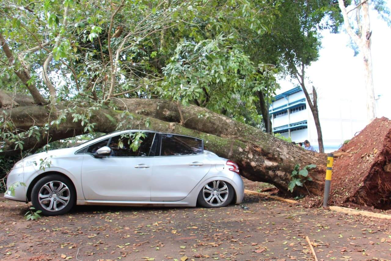 Um ingazeiro caiu no estacionamento da UFMS (Universidade Federal de Mato Grosso do Sul) no final da manhã desta terça-feira (28), em Campo Grande. A árvore tem mais de cinco metros de altura e atingiu em cheio um Peugeot 208. Os galhos do ingazeiro também ficaram sobre o capô de outros três carros. Não ventava nem chovia no momento da queda, e ninguém ficou ferido.