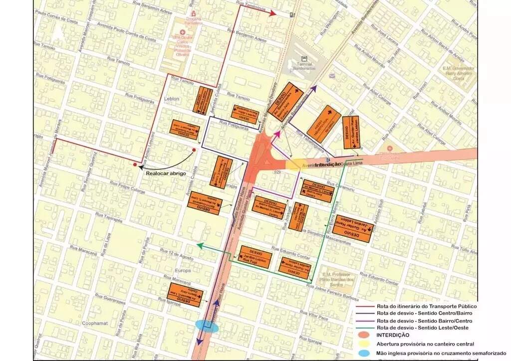 O ponto de ônibus da Rua Clineu da Costa Moraes com a Avenida Cuiabá será provisoriamente transferido para o cruzamento das ruas Amin Lescani e Potiguaras até o fim das obras.