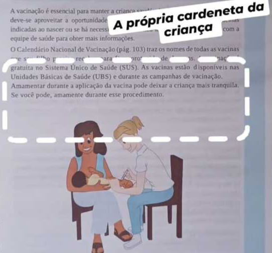 Ainda conforme o texto, nesses casos, o vacinador poderá orientar a mãe a interromper brevemente a amamentação no momento da aplicação. Logo após a vacinação, a criança retorna ao colo materno, podendo retomar imediatamente a amamentação, que contribui para o conforto e para a analgesia no período pós-procedimento".