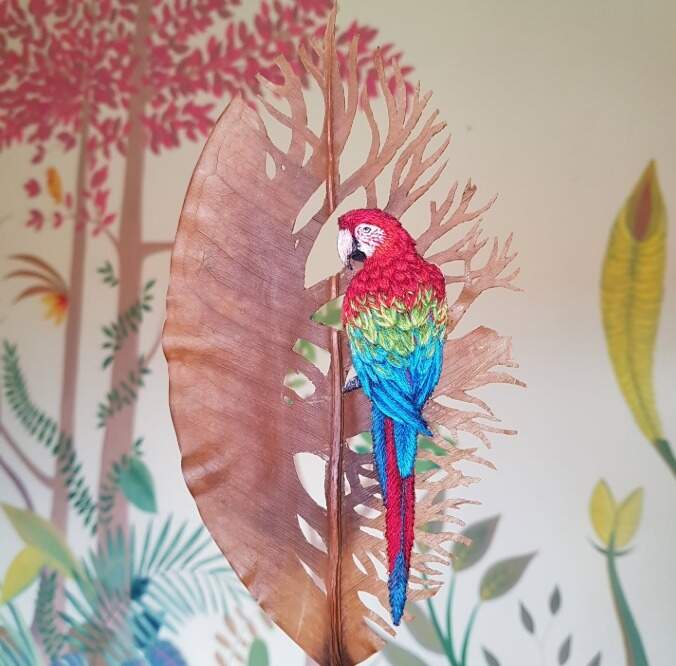Arara-vermelha bordada à mão em folha de falsa-seringueira, junto com os recortes (Foto: Arquivo pessoal)