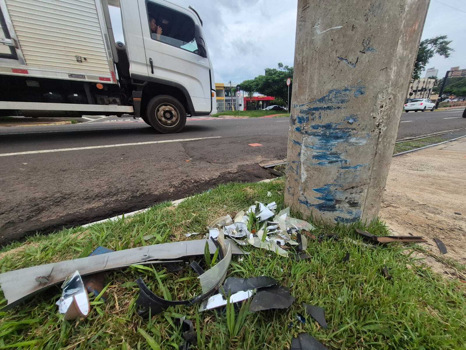 O carro, um Chery QQ azul, ficou com a parte frontal completamente destruída. Pela imagem, é possível ver o para-brisa estilhaçado, o capô amassado e o para-choque arrancado. Pedaços da lataria ficaram espalhados próximos ao poste. Também há marcas de pneu sobre a grama, indicando que o veículo saiu da pista antes da batida.