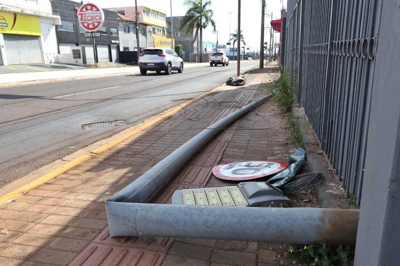 Com o impacto, a caminhonete desviou para a esquerda, atingiu e derrubou um poste de iluminação pública. A queda rompeu cabos de telefonia e internet, que ficaram estendidos na contramão da via.